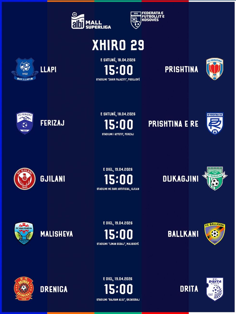 Federata e Futbollit të Kosovës ka publikuar edhe orarin e xhiros së 28-të, ku të shtunën luhen dy ndeshje dhe të dielën tre të tjera.