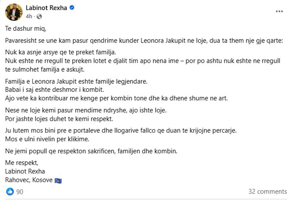 “Pavarësisht se kam pasur qëndrime kundër Leonora Jakupit në lojë, dua ta them qartë: nuk ka asnjë arsye që të preket familja,” shkroi ai, duke shtuar se familja e artistes është “familje legjendare” dhe duke vlerësuar babanë e saj të ndjerë si dëshmor të kombit. Ai theksoi gjithashtu kontributin e Leonorës në muzikë dhe në art për kombin shqiptar, duke bërë thirrje për respekt jashtë lojës.