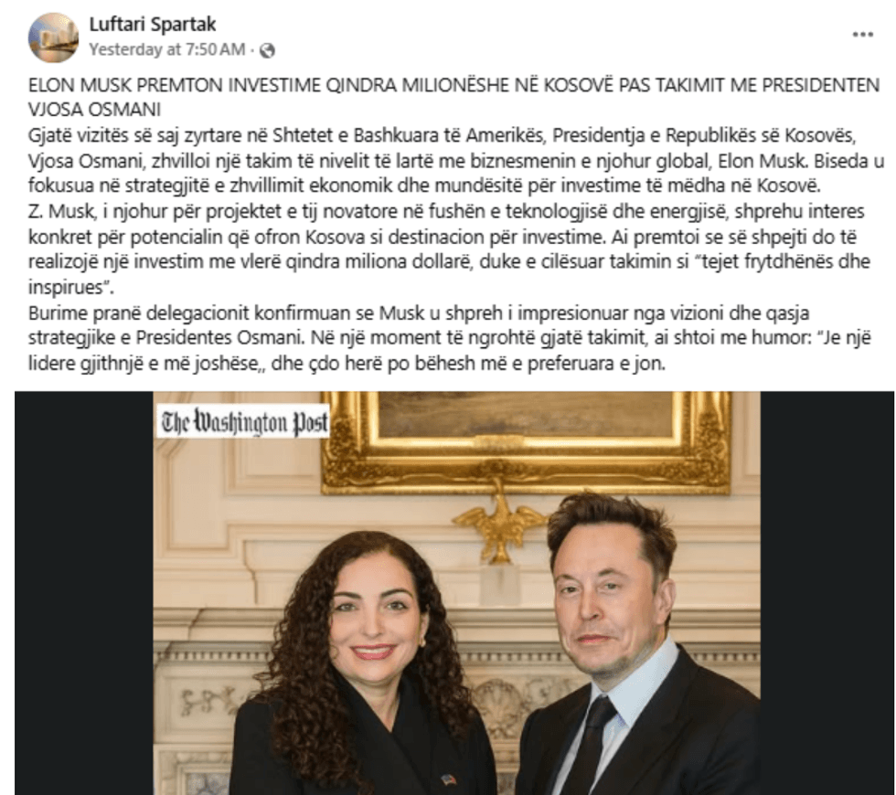 Së fundmi është publikuar një postim me fotografi në rrjete sociale që pretendon se miliarderi i teknologjisë, Elon Musk, ka zhvilluar një takim me Presidenten e Kosovës, Vjosa Osmani, gjatë një vizite në Shtetet e Bashkuara të Amerikës, ku thuhet se ai ka premtuar investime “qindra milionëshe” në Kosovë. Postimi shoqërohet me një fotografi që paraqet dy figurat në një ambient zyrtar.