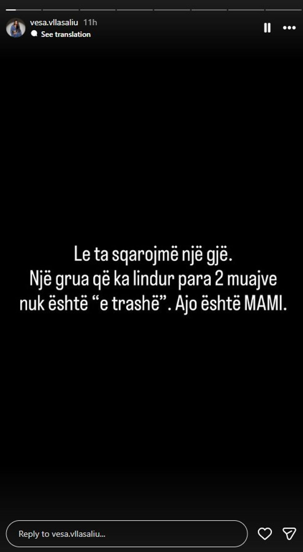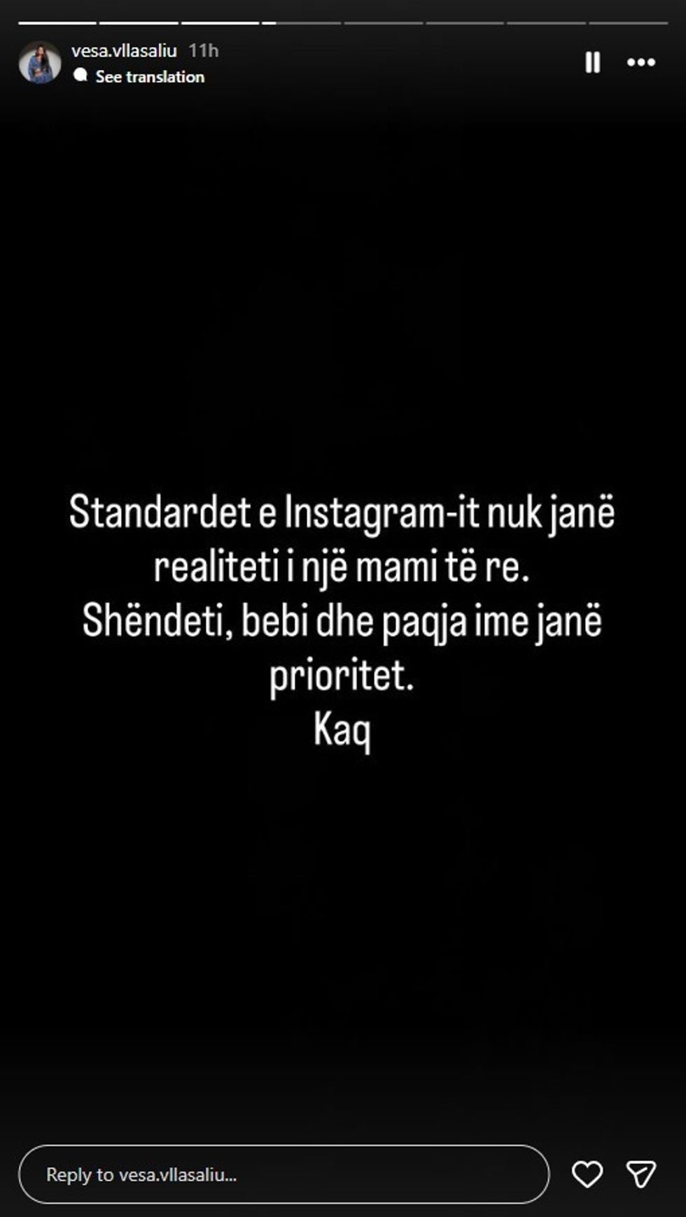 Përmes disa InstaStory-ve, Vesa ka vendosur të sqarojë situatën dhe të dërgojë një mesazh të fortë për standardet e bukurisë dhe presionin ndaj nënave të reja.
