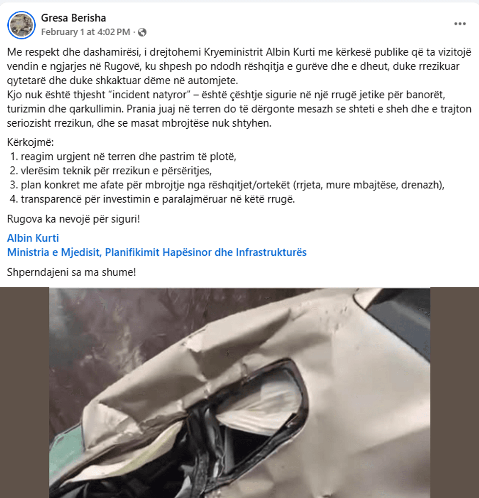 Në një postim në Facebook, qytetarja Gresa Berisha i ka bërë thirrje Kryeministrit në detyrë, Albin Kurti, ku ka kërkuar “reagim urgjent në terren dhe pastrim të plotë”, “vlerësim teknik për rrezikun e përsëritjes”, “plan konkret me afate për mbrojtje nga rrëshqitjet dhe ortekët, përfshirë rrjeta, mure mbajtëse dhe drenazh”, si dhe “transparencë për investimin e paralajmëruar në këtë rrugë”.
