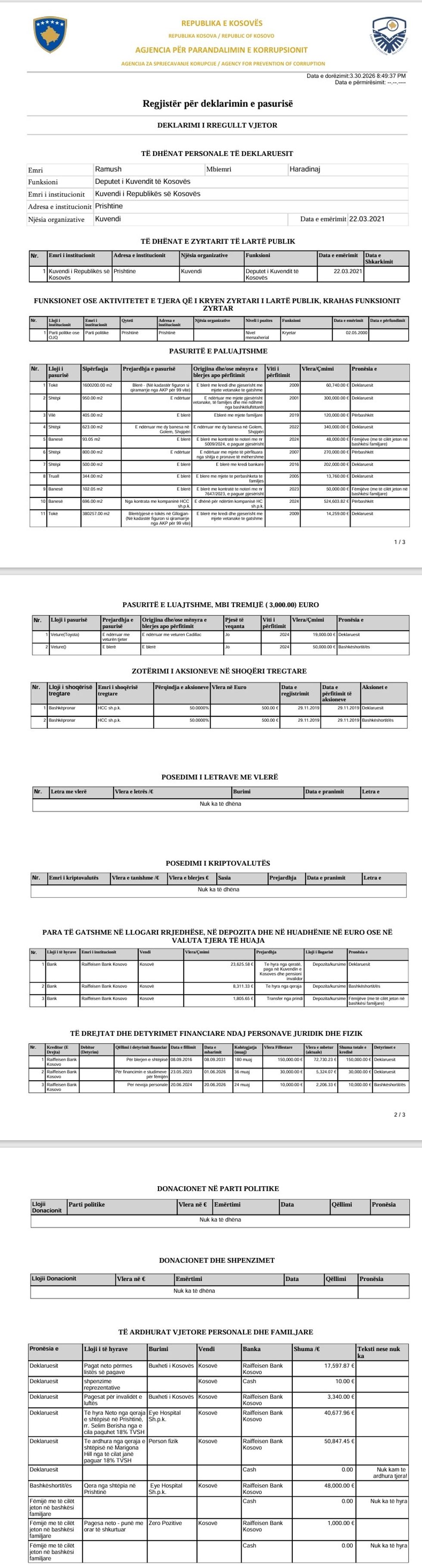 Kryetari i AAK-së, Ramush Haradinaj, ka deklaruar patundshmëri në vlerë mbi 1.9 milionë euro në emër të tij, fëmijëve dhe në pronësi të përbashkët.