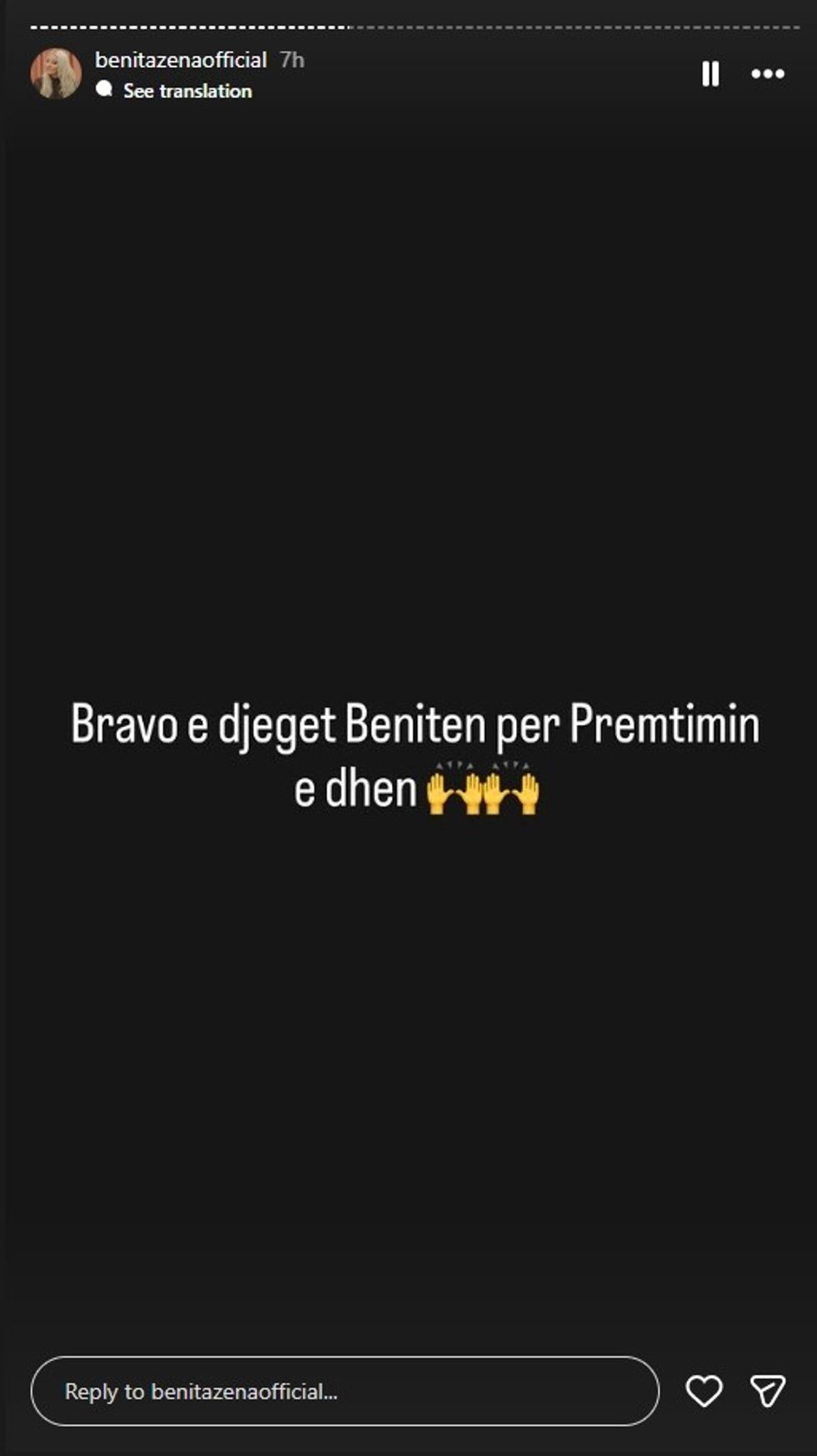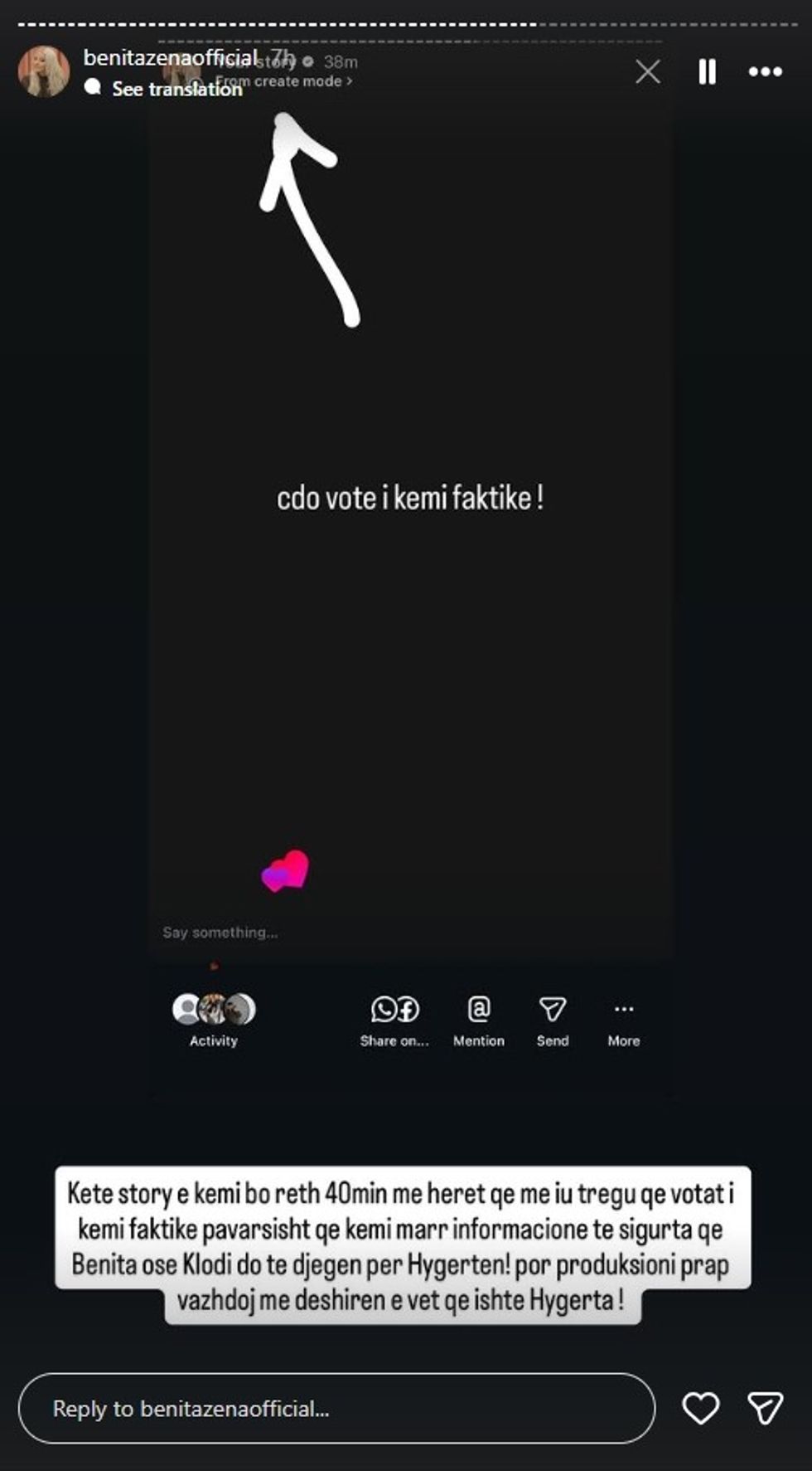 Fillimisht, pak para se të shpalleshin finalistët, në InstaStory u publikua një mesazh ku shkruhej: “Çdo votë e kemi faktike”, duke lënë të kuptohej se ata kishin bindjen se mbështetja e publikut ishte në anën e Benitës.