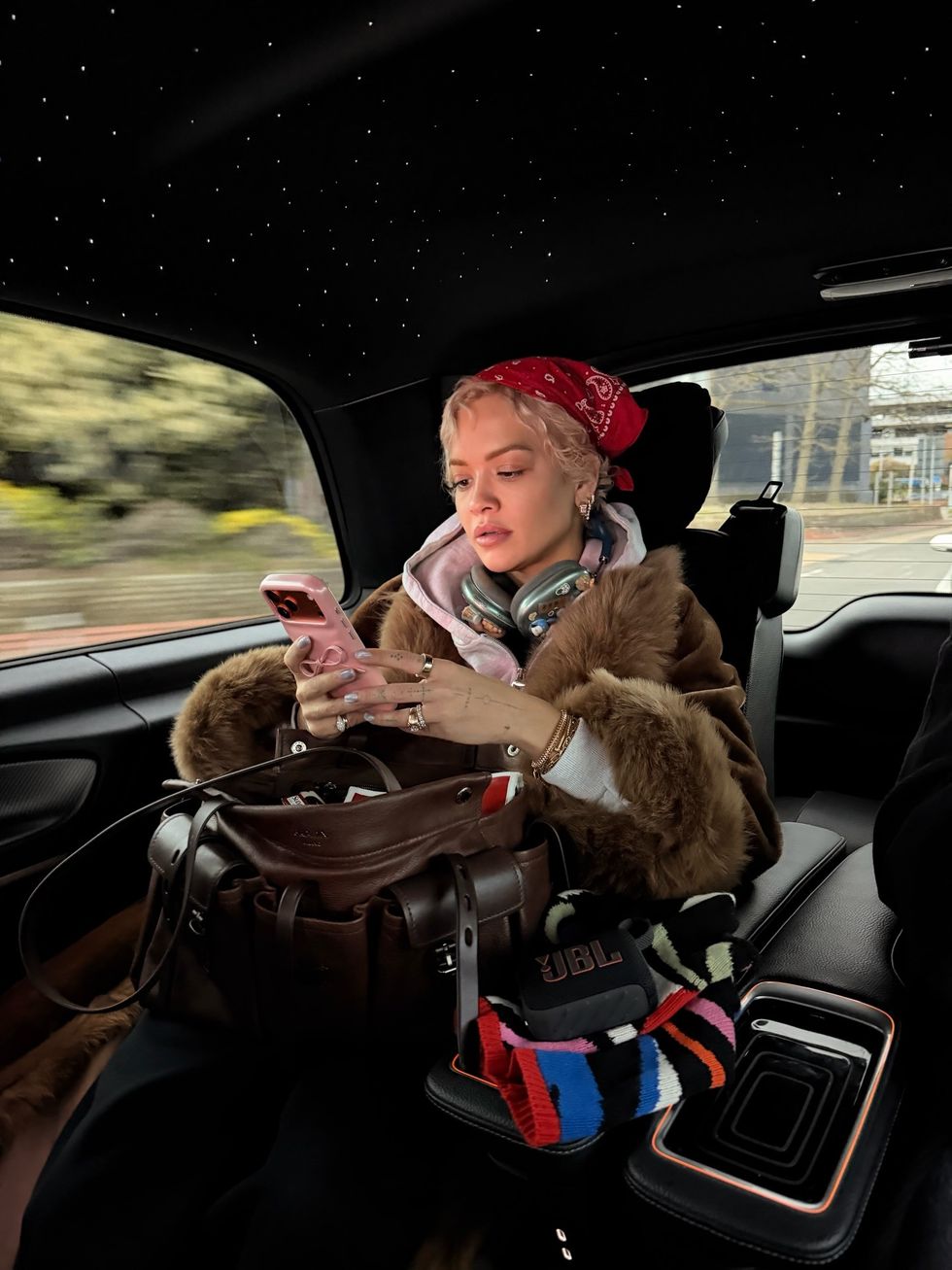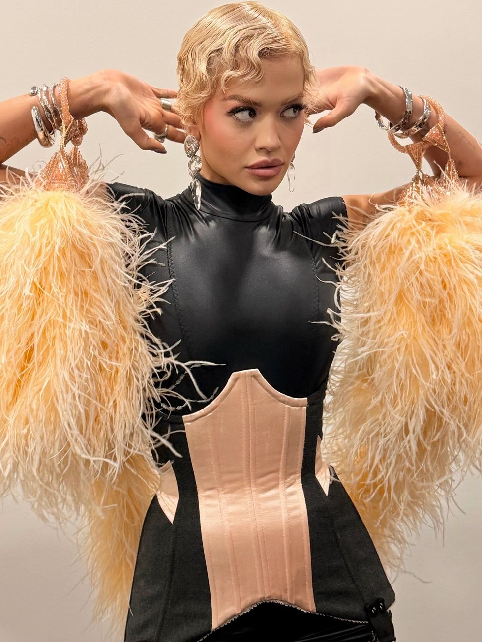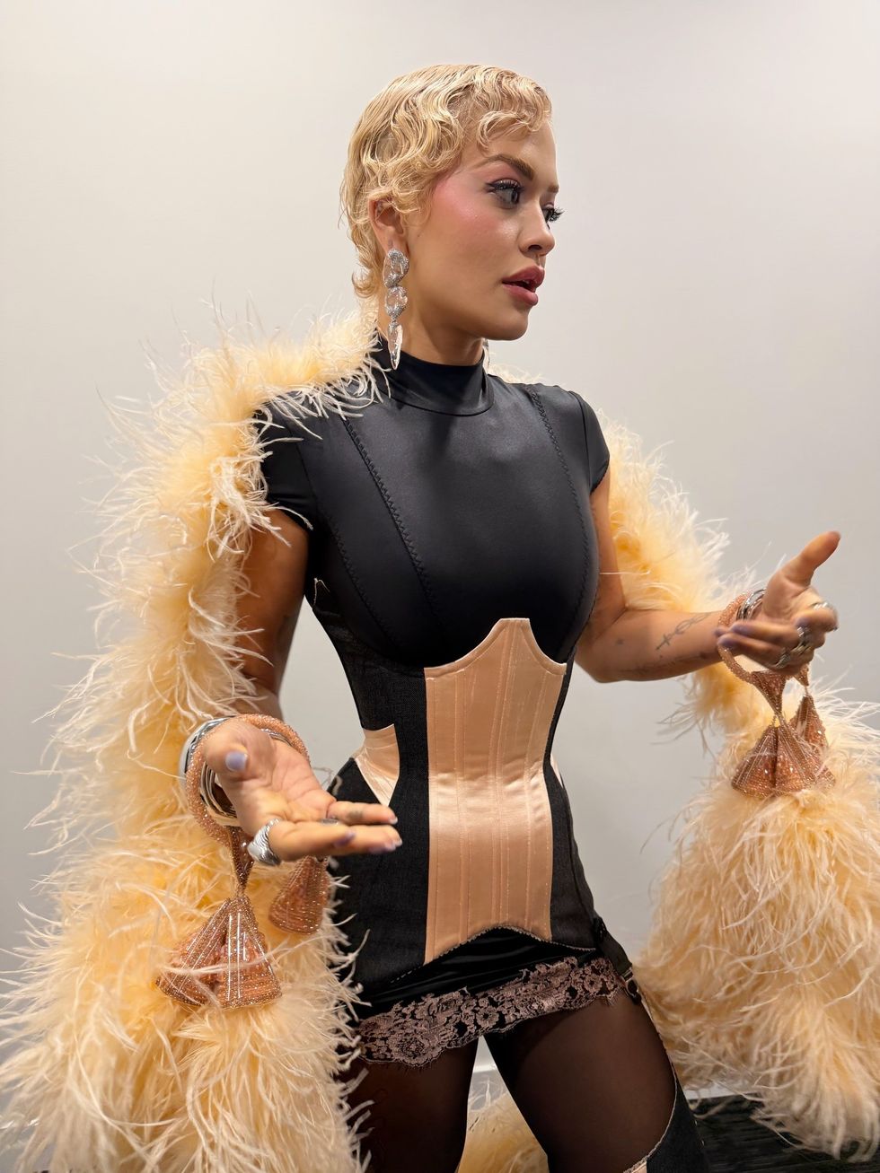 Rita e theksoi edhe më shumë siluetën e saj me një palë çizme të gjata deri në gju me lidhëse dhe vendosi mbi supe një shall me pupla rozë.