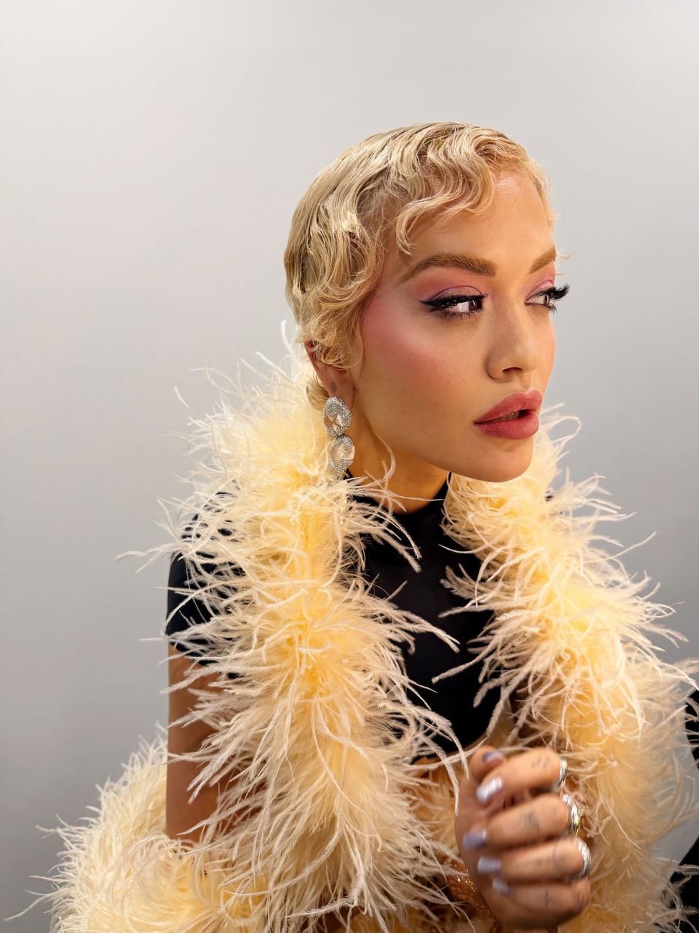 Rita dukej në humor të mirë teksa pozonte në prapaskenë përpara se të dilte para publikut.