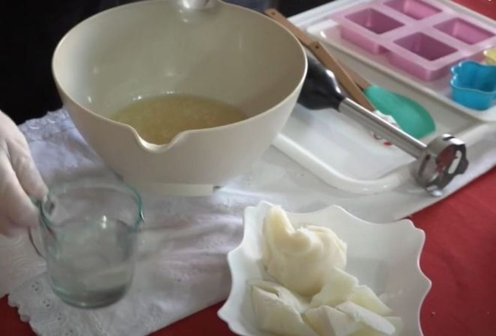 Në një enë të madhe, shtoni gradualisht sodën në ujë të ftohtë (asnjëherë anasjelltas), duke përzier derisa të tretet. Pas ftohjes së lehtë të tretësirës, shtoni yndyrën e shkrirë dhe të vakët, duke përzier vazhdimisht në një drejtim.