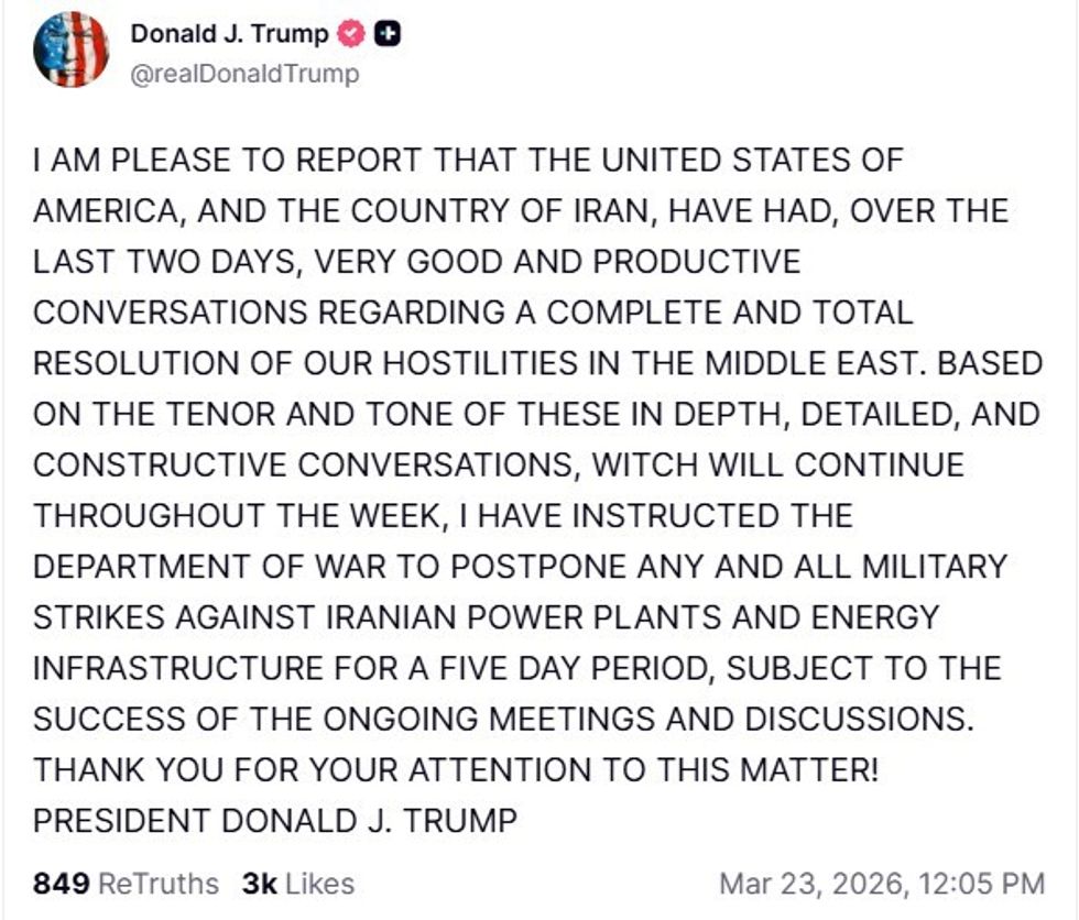 “BAZUAR NË TONIN E KËTYRE BISEDAVE TË THELLA, TË DETAJUARA DHE KONSTRUKTIVE, QË DO TË VAZHDOJNË GJATË GJITHË JAVËS, UNË I KAM UDHËZUAR DEPARTAMENTIT TË LUFTËS QË TË SHTYJË ÇDO SULM USHTARAK KUNDËR centraleve elektrike dhe infrastrukturës ENERGJITIKE IRANIANE PËR NJË PERIUDHË PESË-DITORE, NË VARËSI TË SUKSESIT TË TAKIMEVE DHE DISKUTIMIT QË VAZHDON”, vazhdoi ai.