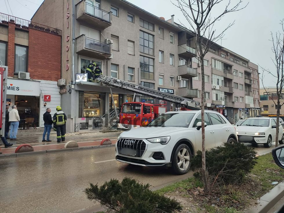 Zjarrfikësit shihen në vendin e ngjarjes, duke intervenuar për largimin e pjesëve të mbetura nga rënia e fasadës.
