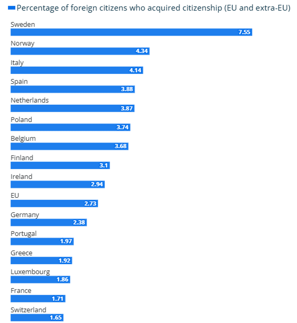Megjithatë, duke u përqendruar në detaje, Suedia ka shkallën më të lartë të natyralizimit, me 7.5 shtetësi të dhëna për çdo 100 “banorë jo-kombëtarë”.