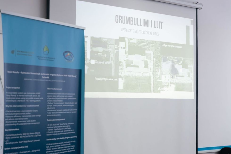 Sistemi i implementuar grumbullon ujin e shiut nga kulmi dhe e ruan atë në rezervuarë, ku më vonë përdoret për ujitje të hapësirave të gjelbra përmes rrjeteve të ujitjes me spërkatje dhe rrjetit pikë-pikë. Përtej funksionit të tij operativ, ky sistem u mundëson nxënësve dhe mësimdhënësve të angazhohen drejtpërdrejt në mësim praktik mbi menaxhimin e qëndrueshëm të ujit.
