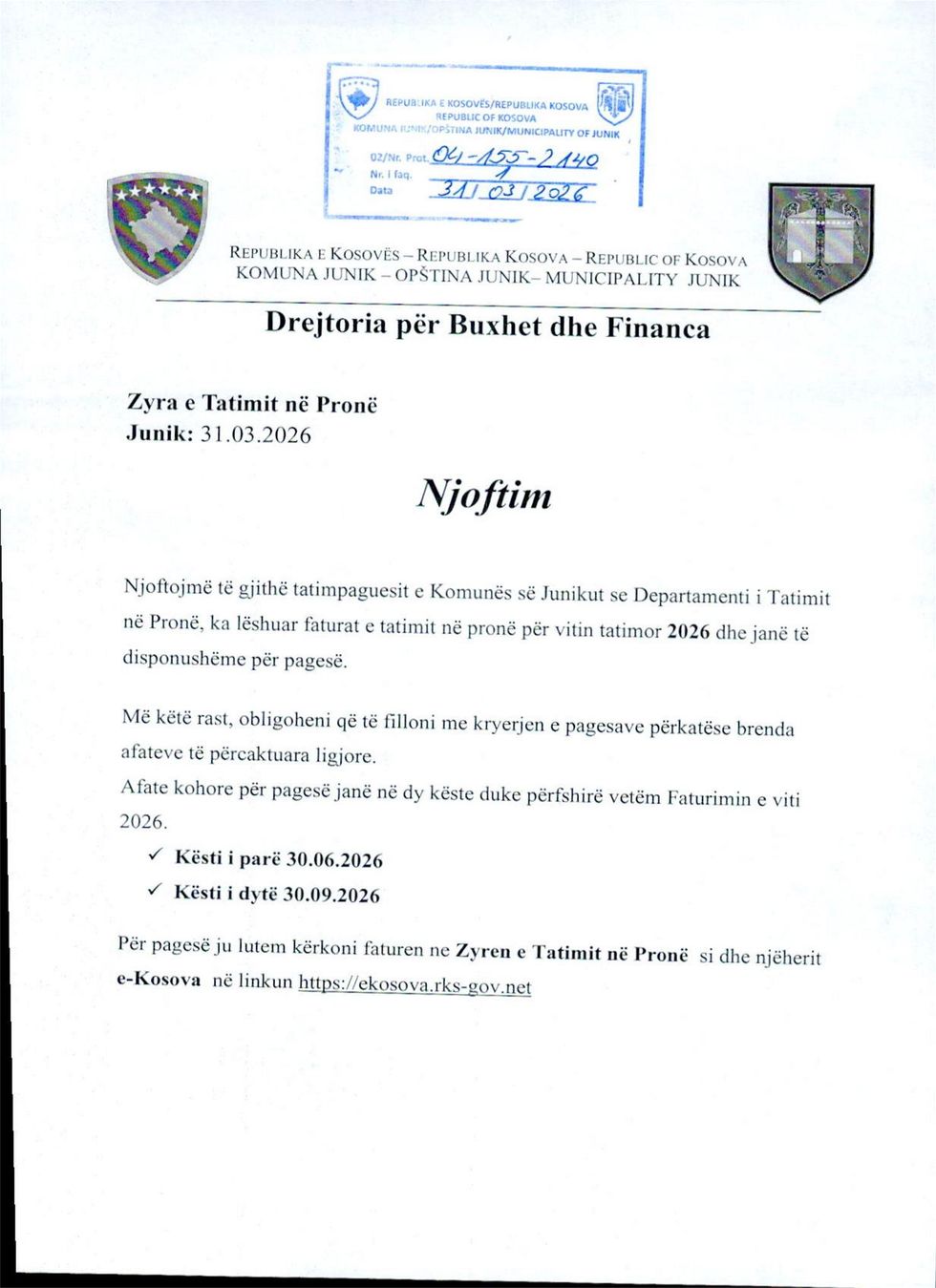 Komuna e Junikut ka njoftuar tatimpaguesit se janë lëshuar faturat e tatimit në pronë për vitin tatimor 2026, të cilat tashmë janë në dispozicion për pagesë.