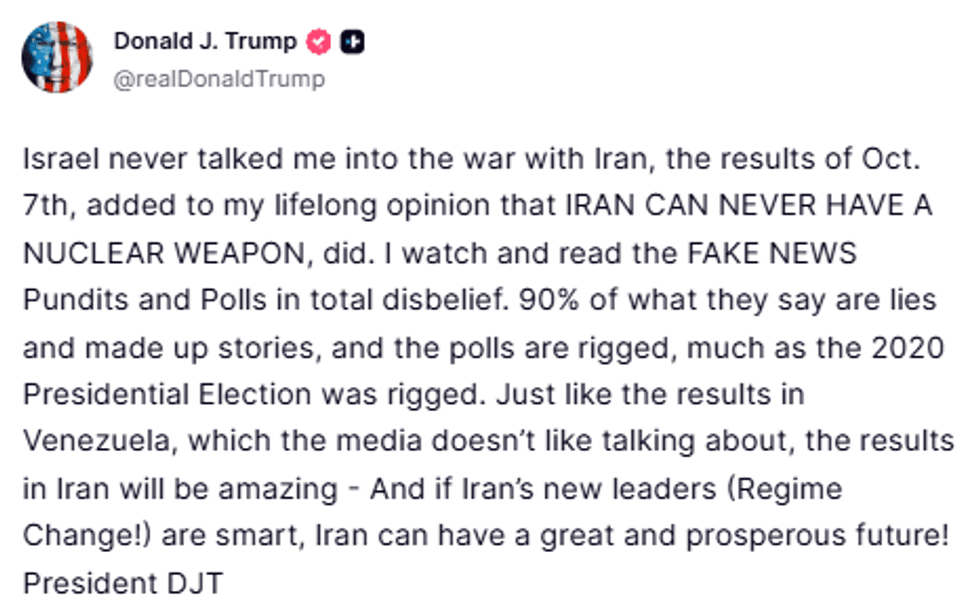 Në vend të kësaj, ai thotë në një postim në Truth Social se përfshirja e Amerikës në konflikt u bazua në 7 tetor, dhe në “mendimin e tij të përjetshëm se Irani nuk mund të ketë kurrë një armë bërthamore”.