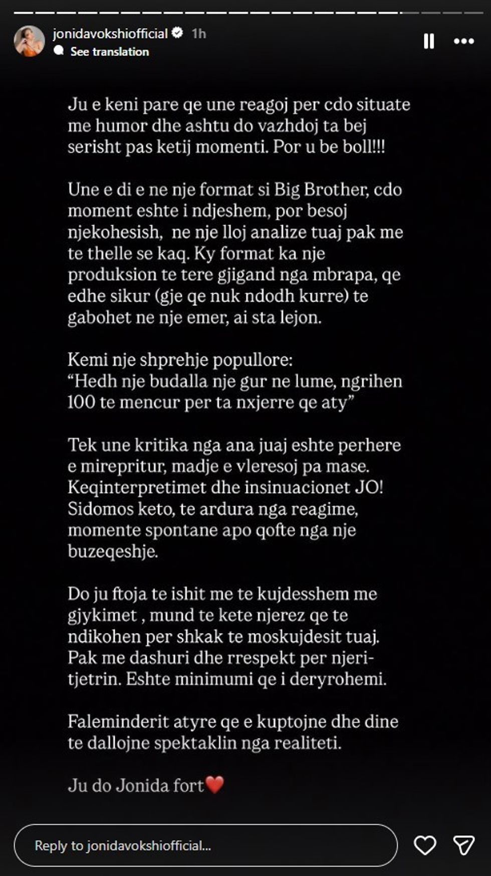 Jonida e mbyll postimin me një apel për më shumë mirëkuptim, dashuri dhe respekt, duke u kërkuar ndjekësve të jenë më të kujdesshëm në gjykime dhe të dinë të dallojnë qartë spektaklin nga realiteti. /Telegrafi/