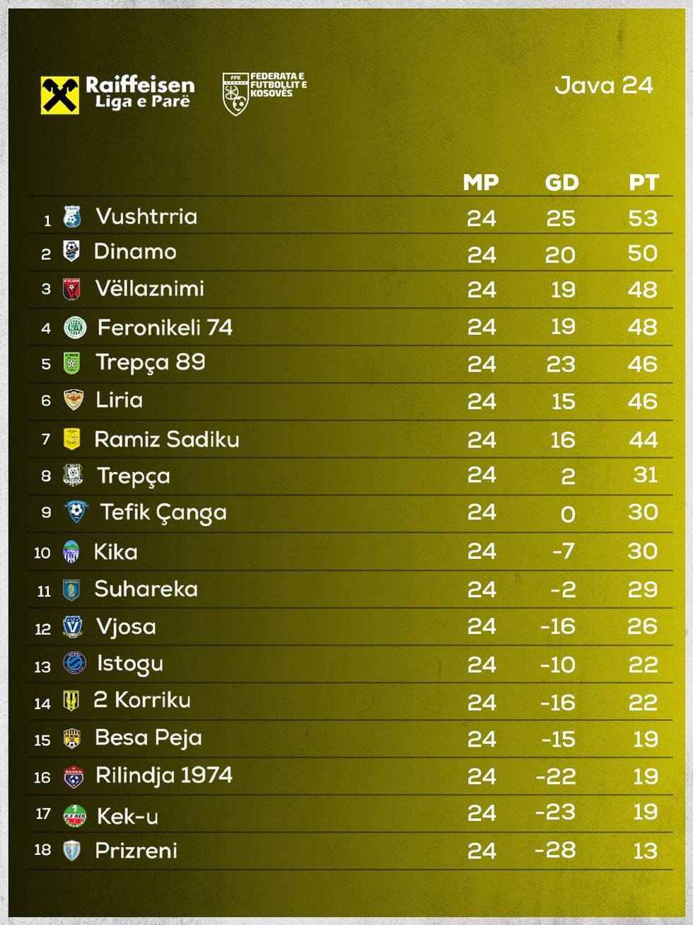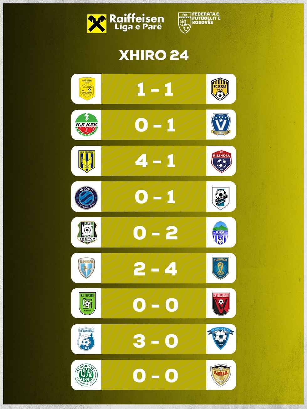 Ka përfunduar xhiro e 24-të në Ligën e Parë të Kosovës në futboll, me Vushtrrinë që është fituesja absolute.
