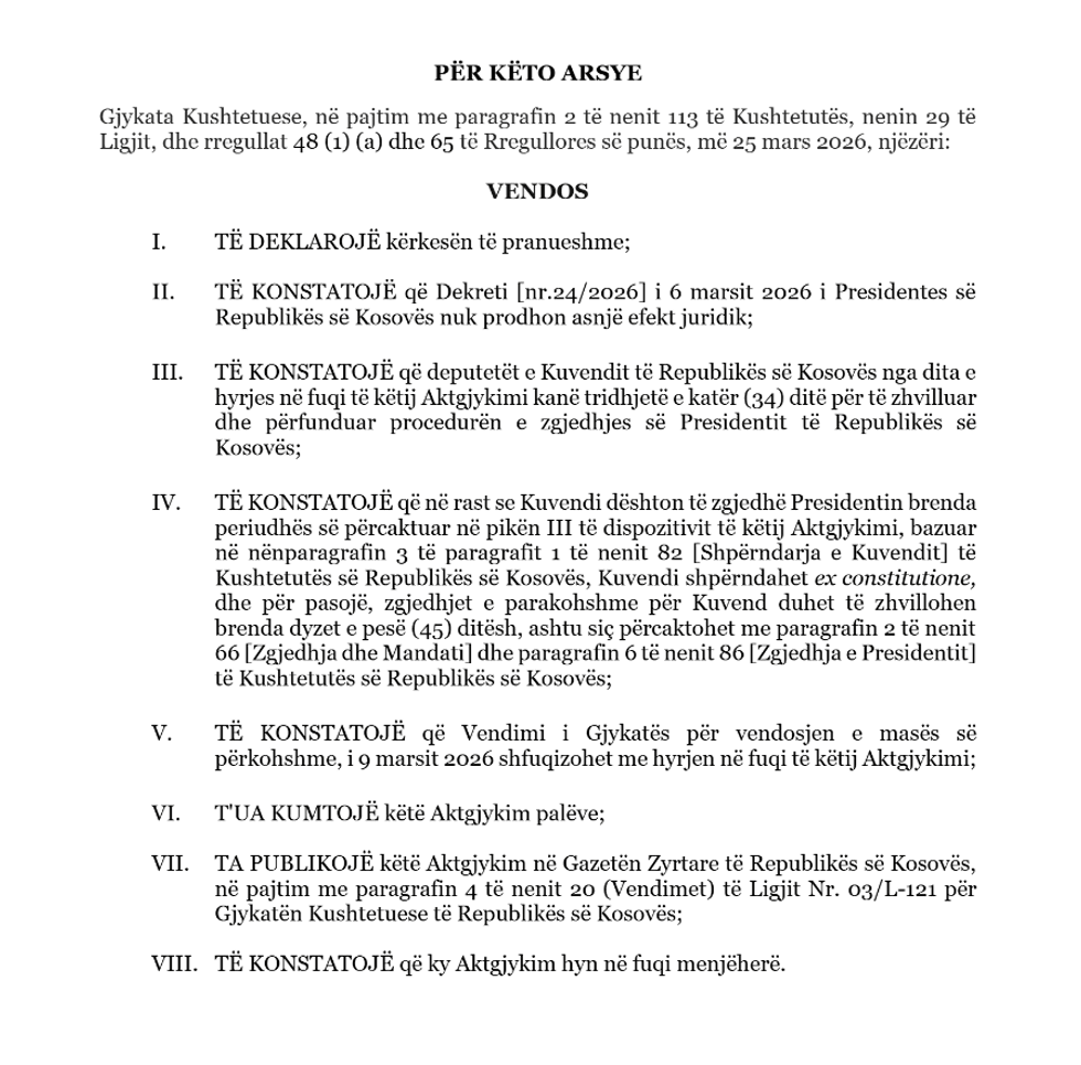 Sipas aktgjykimit të datës 25 mars 2026, Dekreti i Presidentes është shpallur i pavlefshëm dhe nuk prodhon asnjë efekt juridik.