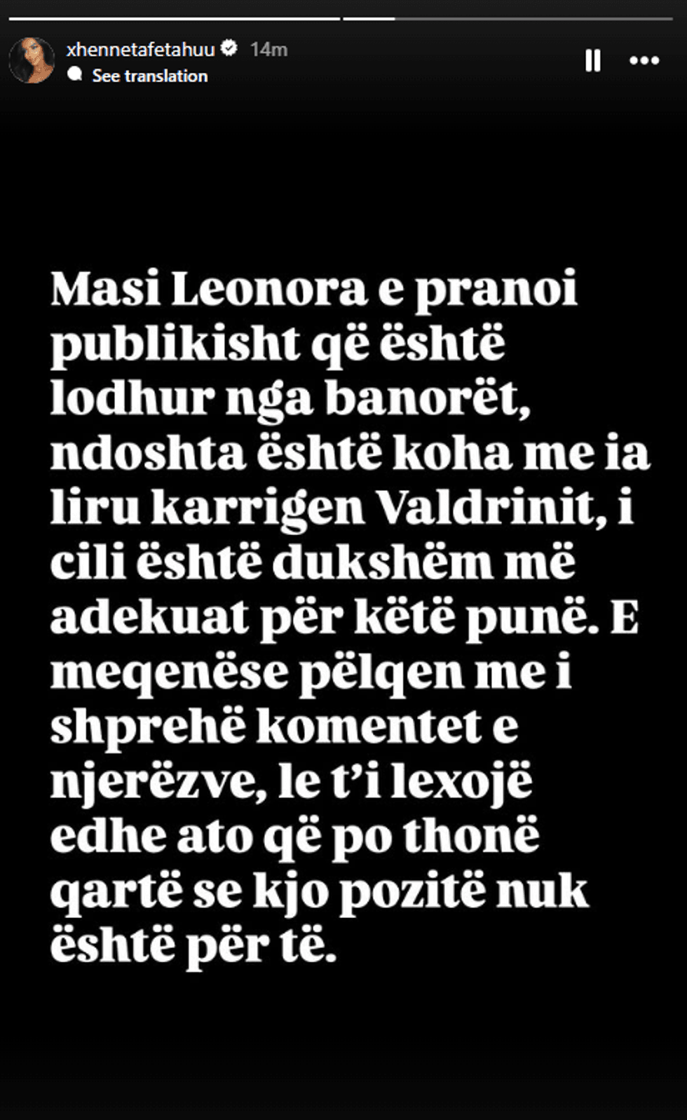 “Pasi Leonora e pranoi publikisht që është e lodhur nga banorët, ndoshta është koha me ia liru karrigen Valdrinit, i cili është dukshëm më adekuat për këtë punë.